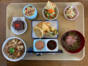 【 献 立 】 ◆鶏肉とエリンギの炊き込みご飯 ◆かも南蛮そば ◆フリッター盛り合わせ ◆クリスマスツリー風サラダ ◆洋風茶碗蒸し ◆長芋とエビのバジルソース和え ◆生チョコ羊羹