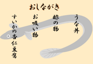 【献 立】 ◆うな丼 ◆酢の物 ◆お吸い物 ◆すいかの杏仁豆腐