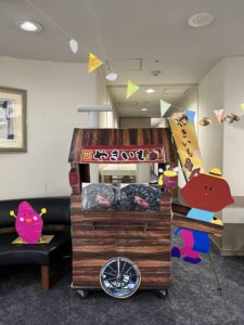 職員が手作りの屋台を引っ張りながら「いしや~きいも~おいも~♪」のBGMと共にやきいもの提供をしました。