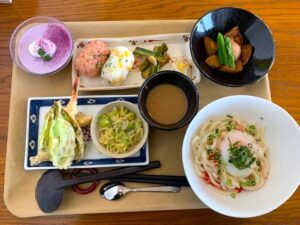 【献 立】◆ミニおにぎり(とうもろこしの塩麹炊き込み御飯・青菜と桜エビの生姜風味御飯)◆ゴマ釜玉うどん ◆春キャベツとしらすの和え物 ◆柚子大根の漬物・胡瓜のにんにく醤油漬け ◆華味鶏肉団子とレッドムーンの揚げ煮 ◆春の天ぷら三種盛り ◆紫芋のムース