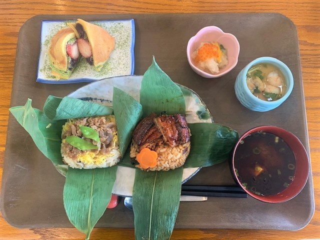 【 献 立 】 ◆炙り鰻の笹の葉飯、牛しぐれの笹の葉飯 ◆魚介のあんかけ茶碗蒸し ◆柚子香おろし和え~イクラ添え~ ◆あおさの赤だし ◆苺の手作り生どら焼き