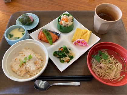 専任の管理栄養士が知恵を絞り、調理師が腕をふるい、旬の食材をふんだんにいかした家庭の味。木々の緑に囲まれた大食堂で、和食・洋食・中華等、バラエティーに富んだお食事を毎日3食、ご用意しています。もちろん、治療食や介護食にも対応しています。