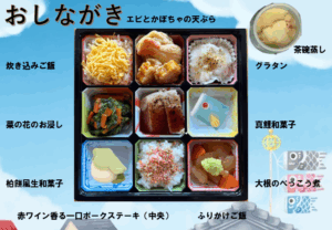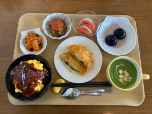 ①果物 ②煮しめ ③ゆかりご飯 ④冷ややっこ ⑤オムライス ⑥抹茶ムース ⑦鶏モモの照り焼き ⑧グラタン